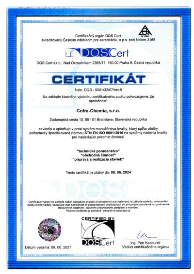 Certifikačný orgán pre integrované manažérske systémy DQS Cert potvrdil, že Cofra – Chemia, s.r.o. má zavedený, udržiavaný a fungujúci integrovaný systém manažérstva, ktorý spĺňa požiadavky noriem: